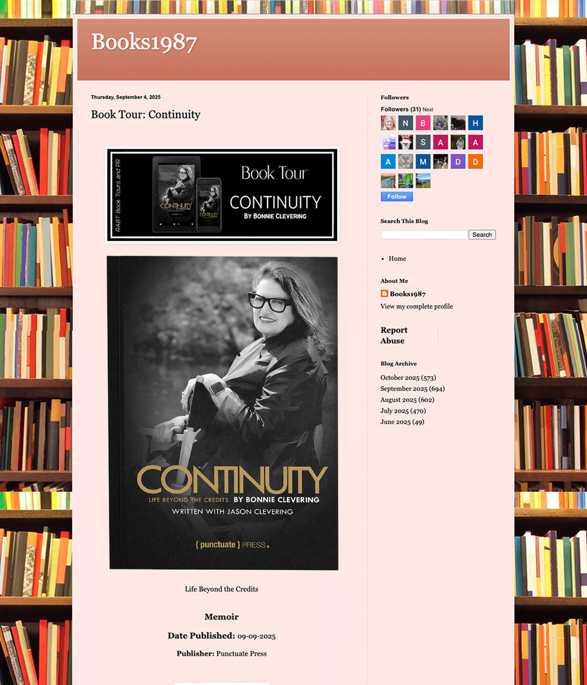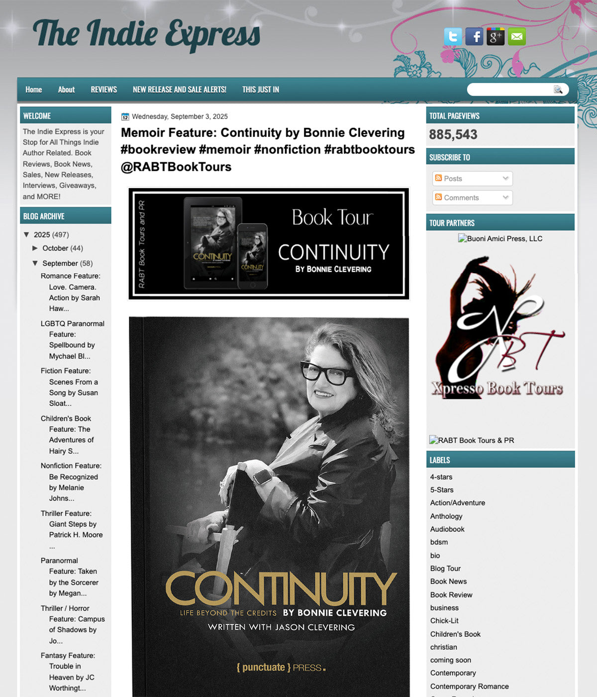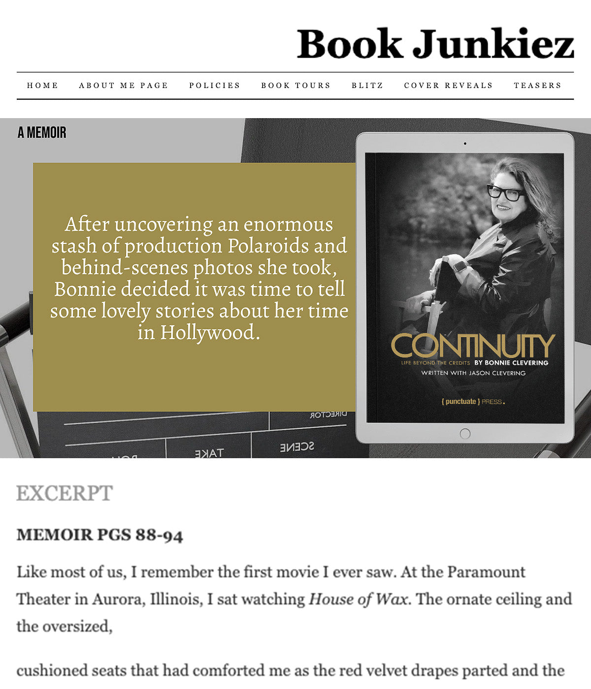 Continuity is a remarkable story of perseverance and creativity that takes the reader behind the scenes on Hollywood’s famed sets. From nearly burning Elvis' pompadour off, to making her infamous recipe of biscuits and gravy for dinner for the cast of Oceans 12 in Vegas, to adventuring with vampires through three films of the Twilight Saga, there was never a dull moment in Bonnie’s career.
